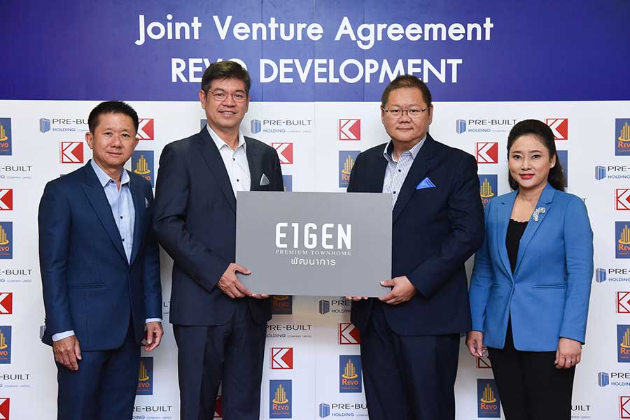 นายวิโรจน์ เจริญตรา (ที่ 2 จากซ้าย) กรรมการผู้จัดการ บมจ.พรีบิลท์ (PREB) ถ่ายภาพร่วมกับนายบุญเลิศ รตินธร (ที่ 2 จากขวา) ประธานเจ้าหน้าที่บริหาร ,นางสาวสุทธิสินี อยู่สวัสดิ์ (ที่ 1 จากขวา) กรรมการผู้จัดการ บริษัท รีโว เอสเตท จำกัด พร้อมด้วย นายมนตรี กิจรุ่งเรืองกูล (ที่ 1 จากซ้าย) กรรมการผู้จัดการ บริษัท เค.อาร์.ซี เอ็นจิเนียริ่ง จำกัด ในโอกาสที่ทั้ง 3 บริษัท ซึ่งเป็นผู้เชี่ยวชาญในธุรกิจอสังหาริมทรัพย์ได้ร่วมมือจัดตั้ง บริษัท รีโว ดีเวลลอปเม้นท์ จำกัด เพื่อพัฒนาโครงการไอเจ้นท์ (EIGEN) ทาวน์โฮมแห่งใหม่ย่านถนนพัฒนาการ ด้วยทุนจดทะเบียน 170 ล้านบาท เมื่อเร็ว ๆ นี้