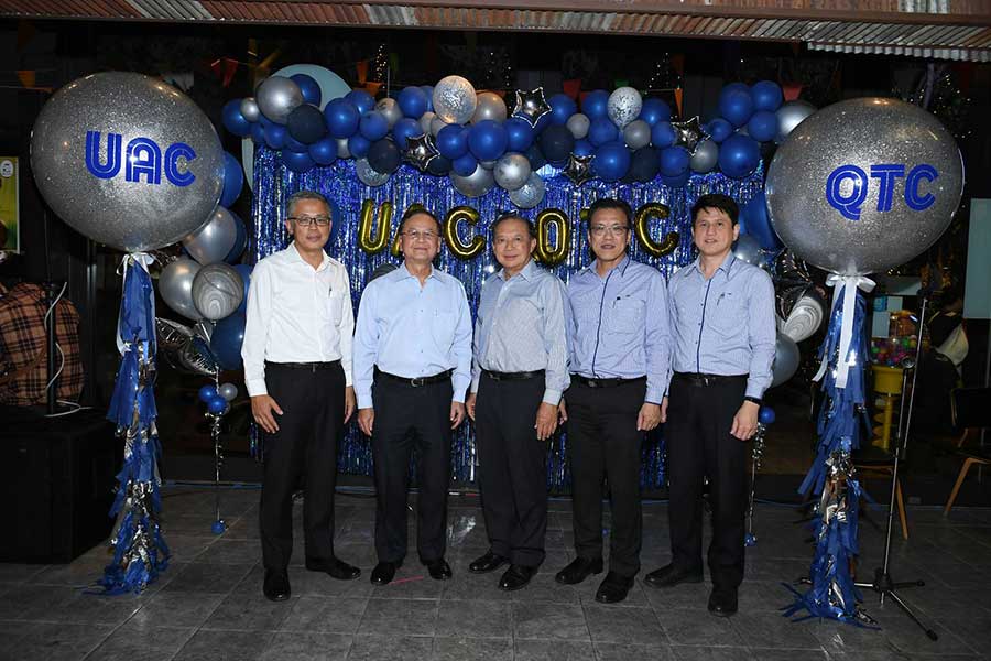 นายกิตติ ชีวะเกตุ (ที่2 จากซ้าย) ประธานกรรมการบริหาร นายชัชพล ประสพโชค (ซ้าย)ประธานเจ้าหน้าที่บริหารและกรรมการผู้จัดการ บมจ.ยูเอซี โกลบอล (UAC) พร้อมด้วย นายพูลพิพัฒน์ ตันธนสิน (กลาง) ประธานเจ้าหน้าที่บริหาร นายเรืองชัย กฤษณเกรียงไกร (ที่ 2 จากขวา) กรรมการผู้จัดการ และ นายกิตติ อัจฉริยบุญยงค์ รองกรรมการผู้จัดการสายการตลาด บมจ.คิวทีซี เอนเนอร์ยี่ (QTC) ร่วมนำเสนอข้อมูลแผนดำเนินธุรกิจปี 2563โดย UAC เปิดกลยุทธ์ลุยโรงไฟฟ้าชุมชน ขณะที่ QTC ชูทิศทางการต่อยอดและแผนรองรับธุรกิจหม้อแปลงไฟฟ้าสู่ EV CAR พร้อมงานเลี้ยงขอบคุณสื่อมวลชน ณ ร้านเพลินวาน พาณิชย์ เดอะสตรีท รัชดา เมื่อเร็วๆ นี้
