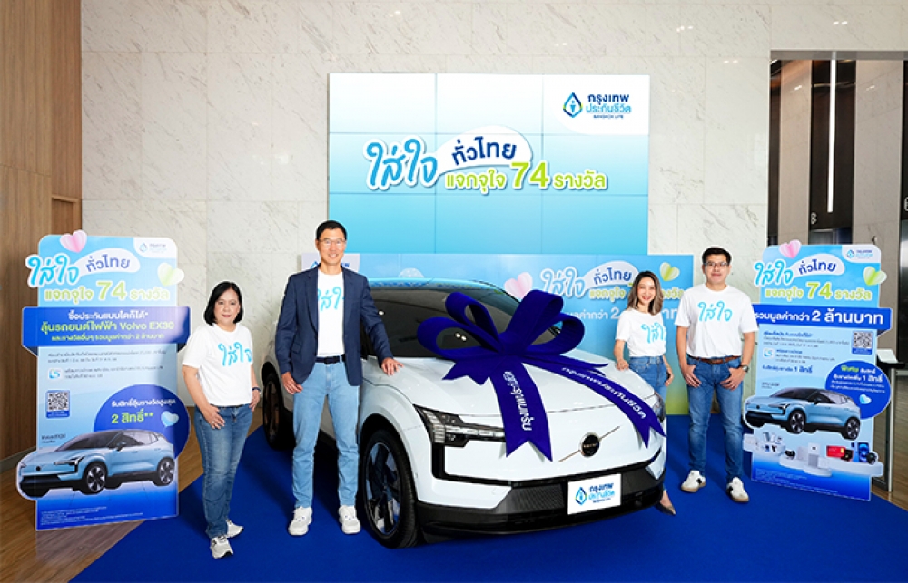 กรุงเทพประกันชีวิต โดย นายโชน โสภณพนิช กรรมการผู้จัดการใหญ่และประธานเจ้าหน้าที่บริหาร และคณะผู้บริหารระดับสูง ฉลองวาระครบรอบ 74 ปี จัดแคมเปญใหญ่ “ใส่ใจทั่วไทย แจกจุใจ 74 รางวัล” เชิญชวนลูกค้าคนสำคัญลุ้นรับรางวัล รถยนต์ไฟฟ้า Volvo EX30 Ultra - Twin Motor Performance สี Cloud Blue มูลค่า 1,540,000 บาท พร้อมของรางวัลอื่น ๆ อีกมากมาย โดยได้คัดสรรของรางวัลด้วยความใส่ใจต่อสิ่งแวดล้อม สุขภาพ คุณภาพชีวิตและความมั่งคั่ง เพื่อมอบเป็นของขวัญให้แก่ลูกค้าที่ได้ให้ความไว้วางใจให้กรุงเทพประกันชีวิตได้ดูแล ร่วมรับสิทธิ์ได้แล้วตั้งแต่วันนี้ ถึงวันที่ 31 ตุลาคม 2568 ดูรายละเอียดเพิ่มเติมได้ที่เว็บไซต์กรุงเทพประกันชีวิต