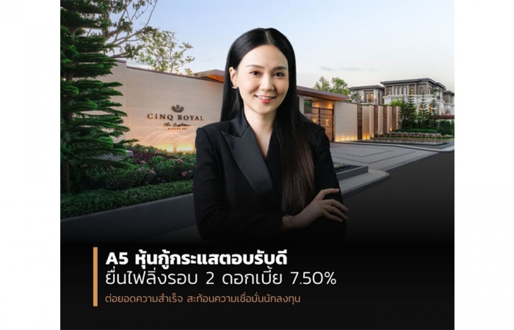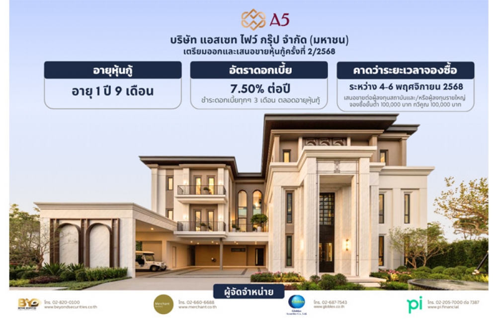 ทั้งนี้ บริษัทมีเป้าหมายที่จะรักษาความแข็งแกร่งทางการเงิน ควบคู่กับการขยายโครงการใหม่ ๆ ที่ตอบโจทย์ความต้องการของตลาดระดับบน การออกหุ้นกู้ครั้งนี้จึงเป็นโอกาสสำหรับนักลงทุนที่จะเข้ามามีส่วนร่วมกับการเติบโตของ A5 ในอนาคต โดยหุ้นกู้ชุดดังกล่าว เสนอขายแก่นักลงทุนสถาบันและ/หรือผู้ลงทุนรายใหญ่ คาดกำหนดวันจองซื้อระหว่างวันที่ 4-6 พฤศจิกายน 2568 และ คาดเสนอขายในวันที่ 7 พ.ย. 2568 ผ่านผู้จัดการการจัดจำหน่ายหุ้นกู้จำนวน 4 แห่ง คือ บริษัทหลักทรัพย์ พาย, บริษัท หลักทรัพย์ โกลเบล็ก, บริษัทหลักทรัพย์ บียอนด์ และบริษัทหลักทรัพย์ เมอร์ชั่น พาร์ทเนอร์ โดยมีธนาคารกรุงเทพ เป็นนายทะเบียนหุ้นกู้ และบริษัทหลักทรัพย์ พาย เป็นผู้แทนผู้ถือหุ้นกู้