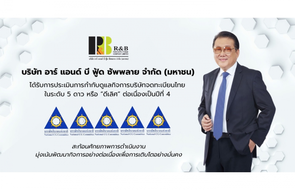 นิวส์ คอนเน็คท์ - ดร.สมชาย รัตนภูมิภิญโญ ประธานเจ้าหน้าที่บริหาร บริษัท อาร์ แอนด์ บี ฟู้ด ซัพพลาย จำกัด (มหาชน) หรือ RBF เปิดเผยว่า RBF ได้รับการประเมินการกำกับดูแลกิจการบริษัทจดทะเบียนไทย หรือ CGR ในระดับ 5 ดาว หรือ “ดีเลิศ” (Excellent CG Scoring) จากสมาคมส่งเสริมสถาบันกรรมการบริษัทไทย (IOD) เป็นปีที่ 4 ติดต่อกัน สะท้อนถึงความแข็งแกร่งในการกำกับดูแลกิจการที่ดี และการดำเนินงานอย่างโปร่งใส นำไปสู่การสร้างการเติบโตในธุรกิจ เพื่อสร้างความเชื่อมั่นให้กับนักลงทุนและผู้มีส่วนได้ส่วนเสียทุกฝ่ายอย่างยั่งยืน