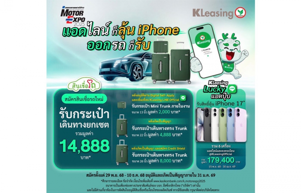 สำหรับโค้งสุดท้ายของปี KLeasing ได้เตรียมแคมเปญ “Lucky LINE & Luggage Set” แอดไลน์ลุ้น iPhone 17 ออกรถรับกระเป๋าเดินทางยกเซต มอบข้อเสนอสุดพิเศษให้กับลูกค้าที่สนใจออกรถใหม่ในช่วง Motor Expo 2025 โดยมีรายละเอียดดังนี้ ผู้ที่แอดไลน์ @kleasingofficial ตั้งแต่วันที่ 15 พ.ย. 2568 ถึง 30 เม.ย. 2569 ลุ้นรับ iPhone17 (256GB) รวม 6 เครื่อง มูลค่ารวม 179,400 บาท ในส่วนของลูกค้าภายในงานมอเตอร์เอ็กซ์โป 2025 ตั้งแต่วันที่ 29 พ.ย. - 10 ธ.ค. 2568 รับทันทีต่อที่ 1 กระเป๋าเดินทาง ขนาด 13 นิ้ว มูลค่า 2,000 บาท เมื่อสมัครสินเชื่อด้วยตนเองผ่าน Digital Self - Apply และได้รับอนุมัติเบื้องต้น พร้อมสมัคร LINE Official Account ของลีสซิ่งกสิกรไทย