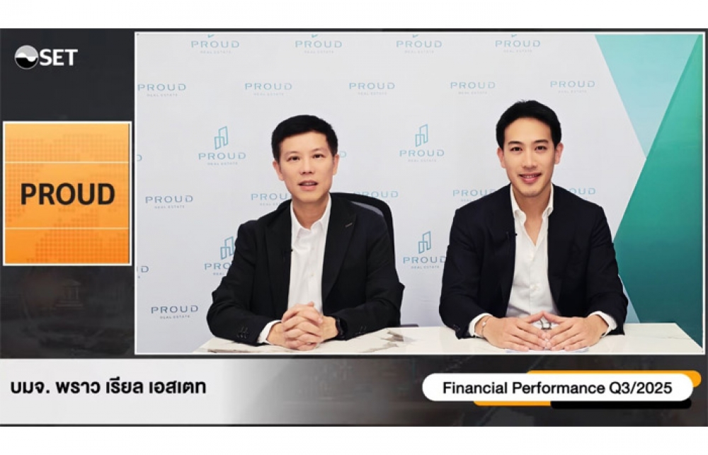 นิวส์ คอนเน็คท์ - นายพสุ ลิปตพัลลภ (ขวา) กรรมการบริหาร และ นายภูมิพัฒน์ สินาเจริญ (ซ้าย) ประธานเจ้าหน้าที่บริหาร บริษัท พราว เรียล เอสเตท จำกัด (มหาชน) หรือ PROUD ให้ข้อมูลผลประกอบการไตรมาส 3/68 รายได้รวม 1,239 ล้านบาท กำไรสุทธิ 55 ล้านบาท เพิ่มขึ้น 1,826% พร้อมทิศทางธุรกิจโค้งสุดท้ายปี 2568 มุ่งเน้นเร่งยอดโอนกรรมสิทธิ์โครงการพร้อมอยู่ ดันยอดขายเติบโตต่อเนื่อง โชว์ Backlog มูลค่า 6,985 ล้านบาท ในงานบริษัทจดทะเบียนพบผู้ลงทุน (Opportunity Day) จัดโดยตลาดหลักทรัพย์แห่งประเทศไทย สามารถรับชมบันทึกเทปได้ที่