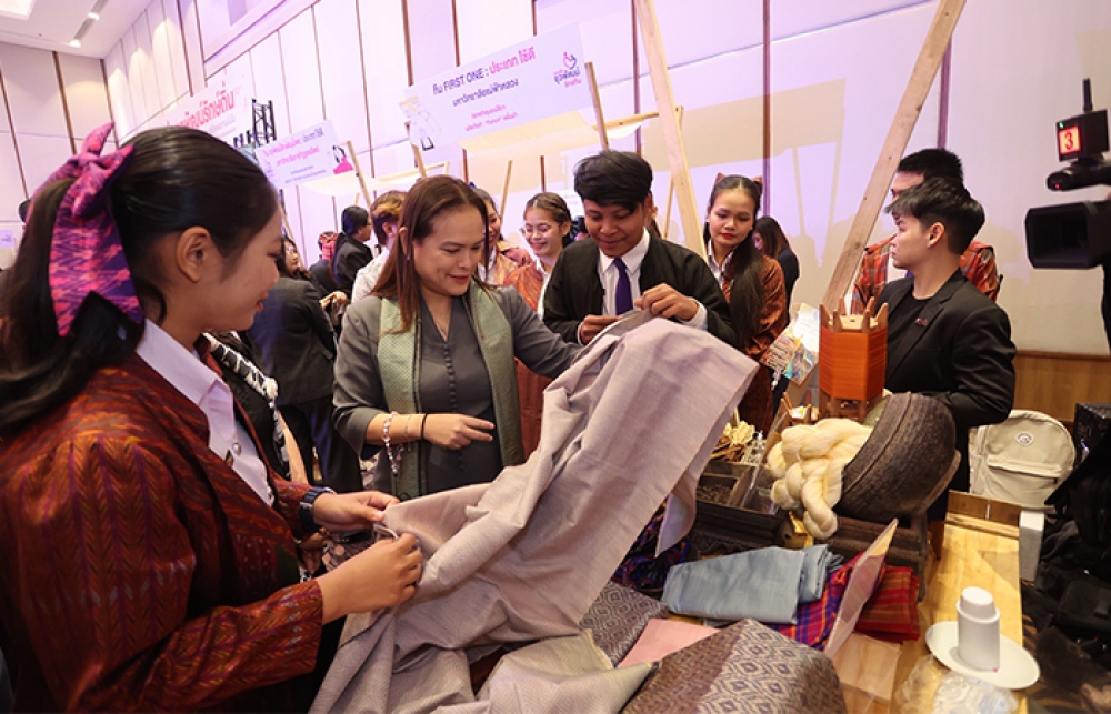 ประเภทรักษ์ดี - ทีมปราจญา ไหมโบราณ มหาวิทยาลัยราชภัฏบุรีรัมย์ พัฒนาวิสาหกิจชุมชนผ้าไหมบ้านตะครอง อ.กระสัง จ.บุรีรัมย์ ด้วยผลิตภัณฑ์ “ผ้าไหมทอมือ ยกขิด ห้วยสำราญ” ต่อยอดผ้าไหมลายเฉพาะของท้องถิ่น และการออกแบบชุดร่วมสมัย