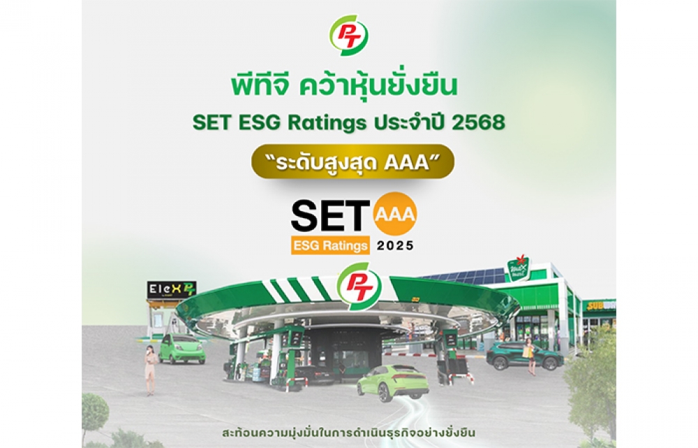 บริษัท พีทีจี เอ็นเนอยี จำกัด (มหาชน) หรือ PTG ได้รับผลการประเมินความยั่งยืน SET ESG Ratings ประจำปี 2568 ในระดับสูงสุด “AAA” จากตลาดหลักทรัพย์แห่งประเทศไทย สะท้อนถึงการดำเนินธุรกิจที่บูรณาการมิติด้านสิ่งแวดล้อม สังคม และบรรษัทภิบาล (ESG) เข้ากับกลยุทธ์และการดำเนินงานขององค์กรอย่างเป็นรูปธรรม