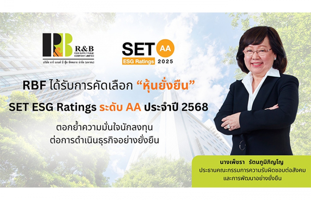 บริษัท อาร์ แอนด์ บี ฟู้ด ซัพพลาย จำกัด (มหาชน) หรือ RBF ได้รับการประเมินหุ้นยั่งยืน SET ESG Ratings ประจำปี 2568 จากตลาดหลักทรัพย์แห่งประเทศไทย ในกลุ่มเกษตรและอุตสาหกรรมอาหาร โดยได้คะแนนระดับ “AA” สะท้อนถึงความมุ่งมั่นของบริษัท ในการดำเนินธุรกิจด้านความยั่งยืน ให้เทียบเท่ามาตรฐานในระดับสากล ควบคู่ไปกับการสร้างการเติบโตทางธุรกิจ การพัฒนานวัตกรรมและสร้างผลตอบแทนที่ดีให้แก่ผู้ลงทุนในระยะยาว
