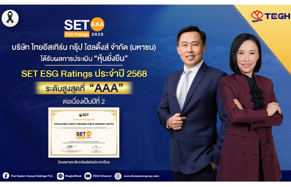 บริษัท ไทยอีสเทิร์น กรุ๊ป โฮลดิ้งส์ จำกัด (มหาชน) (TEGH) ได้รับการจัดอันดับหุ้นยั่งยืน SET ESG Ratings ประจำปี 2568 ในระดับสูงสุด “AAA” ต่อเนื่องเป็นปีที่ 2 จากตลาดหลักทรัพย์แห่งประเทศไทย ในกลุ่มอุตสาหกรรมเกษตรและอาหาร (Agro & Food Industry) การได้รับผลการประเมินในระดับสูงสุดครั้งนี้ ตอกย้ำความมุ่งมั่นของ TEGH ที่มีการดำเนินธุรกิจอย่างยั่งยืน โดยคำนึงถึงสิ่งแวดล้อม มีความรับผิดชอบต่อสังคม และมีการบริหารงานตามหลักบรรษัทภิบาล (Environmental, Social and Governance: ESG) มีการนำแนวคิดด้านความยั่งยืนเข้ามาเป็นส่วนหนึ่งในแผนกลยุทธ์ และกระบวนการดำเนินธุรกิจ คำนึงถึงการบริหารความเสี่ยงและเตรียมรับมือกับการเปลี่ยนแปลงที่เกิดขึ้นใหม่ ควบคู่ไปกับการสร้างผลประกอบการที่ดี ยกระดับห่วงโซ่อุปทานให้มีความยั่งยืน พร้อมเพิ่มขีดความสามารถในการแข่งขัน และให้ความสำคัญกับผู้มีส่วนได้เสียทุกภาคส่วน