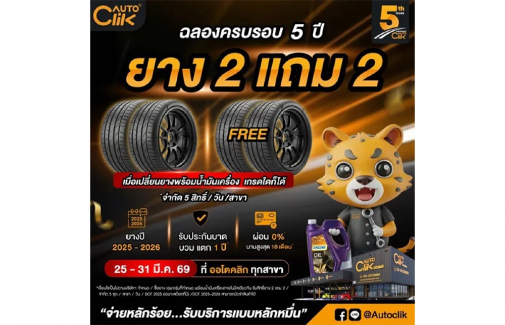 นิวส์ คอนเน็คท์ - ออโตคลิก (Autoclik) ศูนย์บริการรถยนต์ Fastfit ฉลองครบรอบ 5 ปี ออโตคลิก จัดแคมเปญโปรโมชั่นสุดคุ้ม “ยาง 2 แถม 2” เพื่อเป็นการขอบคุณลูกค้าทุกท่านที่ให้การสนับสนุนมาโดยตลอด โดยลูกค้าสามารถเข้ารับบริการและรับสิทธิ์สุดพิเศษนี้ได้ที่ออโตคลิกทุกสาขาทั่วประเทศ ระหว่างวันที่ 25 – 31 มี.ค. 2569