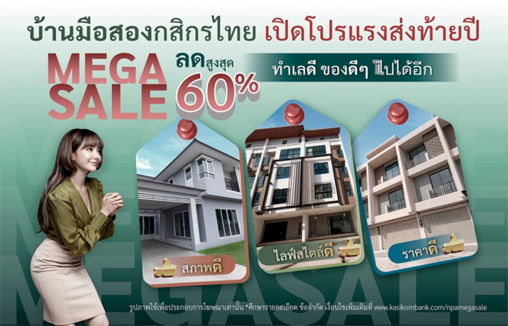 นิวส์ คอนเน็คท์ – ธนาคารกสิกรไทย หรือ KBANK จัดโปรแรงส่งท้ายปี บ้านมือสองกสิกรไทย ให้ลูกค้าทั้งกลุ่มคนอยากมีบ้าน เจ้าของกิจการหรือนักลงทุนอสังหาริมทรัพย์ กับแคมเปญใหญ่ Mega Sale ลดสูงสุด 60% คัดสรรทรัพย์คุณภาพทั่วประเทศ ทั้งบ้านเดี่ยว ทาวน์โฮม คอนโดมิเนียม และอาคารพาณิชย์ ราคาดี ทำเลดี และสภาพดี กับบ้านมือสองกสิกรไทย ของดี ๆ ไปได้อีก พร้อมสิทธิพิเศษ ฟรีค่าโอนสูงสุด 300,000 บาท และกู้ได้สูงสุด 110%