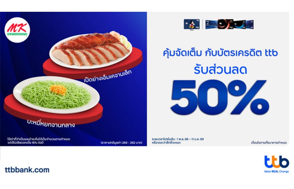 นิวส์ คอนเน็คท์ – ธนาคารทหารไทยธนชาต หรือ ทีทีบี มอบความคุ้มแบบจัดเต็มให้กับสมาชิกบัตรเครดิต ttb บัตรเครดิต ttb Global House และบัตรเครดิต ttb Disney ด้วยโปรโมชันสุดพิเศษรับส่วนลด 50% สำหรับเมนูจานเด็ด “เป็ดย่าง MK จานเล็ก” และ “บะหมี่หยกจานกลาง” จากราคาปกติ 269 – 292 บาท (ราคาสินค้าอาจแตกต่างกันแต่ละสาขา) เมื่อชำระค่าอาหารผ่านบัตรเครดิต ttb และมียอดขั้นต่ำ 1,000 บาทขึ้นไป / เซลล์สลิป จำกัด 1 สิทธิ์ / ท่าน / ใบเสร็จ / วัน (สูงสุด 2 สิทธิ์ / ท่าน ตลอดรายการ) โดยสิทธิพิเศษนี้สำหรับการรับประทานที่ร้าน MK Restaurants ทุกสาขาทั่วประเทศ ตั้งแต่วันที่ 1 พฤศจิกายน 2568 - 11 มกราคม 2569 ศึกษารายละเอียดเพิ่มเติมของโปรโมชัน ได้ที่