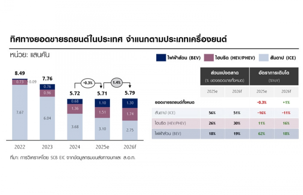 นิวส์ คอนเน็คท์ - SCB EIC ประเมินอุตสาหกรรมยานยนต์ไทยได้ผ่านจุดต่ำสุดไปแล้ว แต่การฟื้นตัวในระยะข้างหน้าจะยังไม่ทั่วถึง คาดยอดขายรถยนต์ในประเทศจะอยู่ที่ 5.71 แสนคัน หรือขยายตัวเพียง 1% ในปี 69 พร้อมมองตลาดรถยนต์ไฟฟ้าขยายตัวต่อเนื่อง คาดครองมาร์เก็ตแชร์มากกว่าครึ่งของตลาดรถยนต์