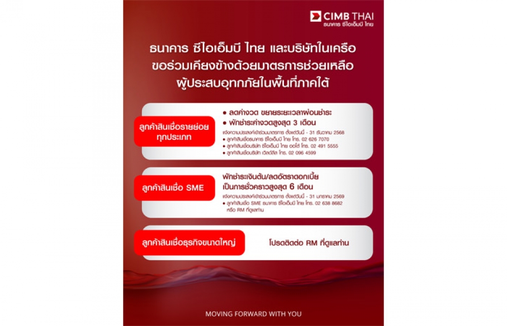 นิวส์ คอนเน็คท์ - ธนาคาร ซีไอเอ็มบี ไทย และบริษัทในเครือ ขอร่วมเคียงข้างและบรรเทาภาระให้ลูกค้าที่ได้รับผลกระทบจากอุทกภัยในพื้นที่ภาคใต้ด้วยมาตรการช่วยเหลือพิเศษสำหรับลูกค้าสินเชื่อทุกกลุ่ม เพื่อให้สามารถบริหารจัดการภาระทางการเงินได้อย่างต่อเนื่องในช่วงสถานการณ์น้ำท่วม
