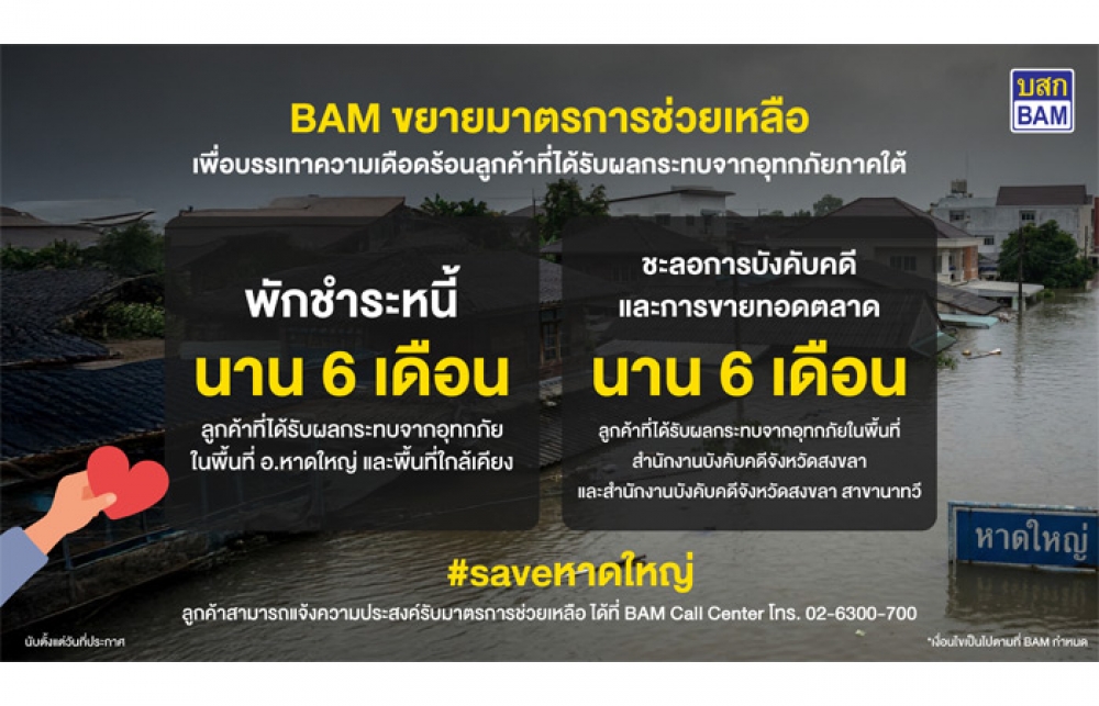 “BAM มีความห่วงใยลูกค้าในพื้นที่ที่ประสบภัยน้ำท่วมใหญ่ในพื้นที่อำเภอหาดใหญ่และภาคใต้ จึงได้ออกมาตรการเพิ่มเติม พร้อมสั่งการให้เจ้าหน้าที่ลงไปสำรวจพื้นที่เพื่อรับทราบปัญหาของลูกค้า พร้อมทั้งเรื่องเดือดร้อนอื่นๆ เข้ามาเพื่อส่งเรื่องขออนุมัติให้ความช่วยเหลือในด้านการผ่อนปรนเงื่อนไขการชำระหนี้ สำหรับช่วยบรรเทาความเดือดร้อนของลูกค้าต่อไป” ดร.รักษ์ กล่าว
