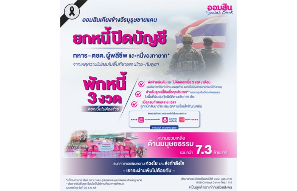 เมื่อวันที่ 26 ธันวาคม 2568 นางลภาวรรณ จันทร์กระจ่าง รองผู้อำนวยการธนาคารออมสิน รักษาการแทนผู้อำนวยการธนาคารออมสิน เปิดเผยว่า จากสถานการณ์ความไม่สงบในพื้นที่บริเวณชายแดนไทย-กัมพูชา ซึ่งส่งผลให้เกิดความสูญเสียต่อกำลังพลผู้ปฏิบัติหน้าที่ปกป้องอธิปไตยของประเทศ ล่าสุด ธนาคารออมสิน ออกชุดมาตรการเฉพาะกิจ ประกาศยกหนี้ปิดบัญชีสินเชื่อเป็นกรณีพิเศษ แก่ทหาร ตำรวจตระเวนชายแดน (ตชด.) และกำลังพลหน่วยอื่น ๆ ที่เสียชีวิตจากการปฏิบัติหน้าที่ในเหตุการณ์ดังกล่าว ตั้งแต่วันที่ 7 ธ.ค. 2568 เป็นต้นมา โดยการยกหนี้ยังครอบคลุมถึงบัญชีสินเชื่อของทายาท 3 ลำดับ ได้แก่ บิดามารดา คู่สมรส และบุตรโดยชอบด้วยกฎหมาย รวมถึงการมอบเงินช่วยเหลือแก่ครอบครัวกำลังพลที่เสียชีวิต ตลอดจนกำลังพลและพลเรือนที่บาดเจ็บจากการสู้รบ เพื่อเชิดชูเกียรติที่ได้ปฏิบัติหน้าที่ด้วยความเสียสละ และเป็นขวัญกำลังใจแก่ครอบครัวในช่วงเวลาที่ยากลำบากนี้