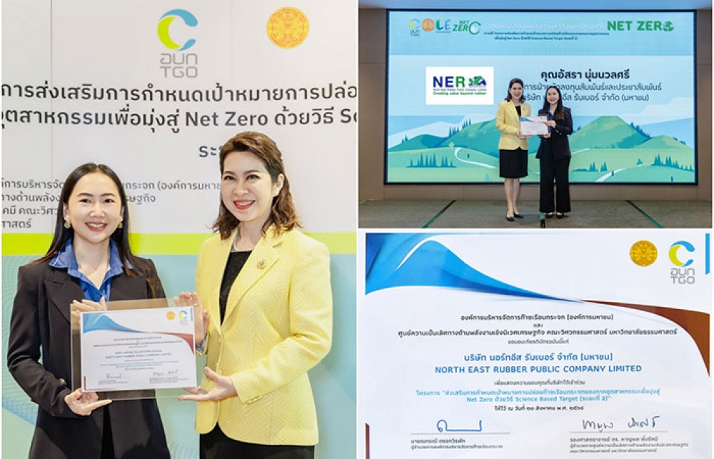 นิวส์ คอนเน็คท์ - เมื่อวันที่ 2 มกราคม 25698 บริษัท นอร์ทอีส รับเบอร์ จำกัด (มหาชน) หรือ NER ผู้ดำเนินธุรกิจผลิตและจำหน่าย ยางแผ่นรมควัน ยางแท่ง ยางผสม และสินค้าปลายน้ำแผ่นยางพาราปูพื้นคุณภาพสูง เพื่อจำหน่ายไปยังผู้ผลิตในอุตสาหกรรมยานยนต์ กลุ่มผู้ค้าคนกลาง ทั้งในประเทศและต่างประเทศ แจ้งว่า บริษัทฯ ได้รับ 2 ใบประกาศเกียรติคุณ จากองค์การบริหารจัดการก๊าซเรือนกระจก (องค์การมหาชน) หรือ อบก.