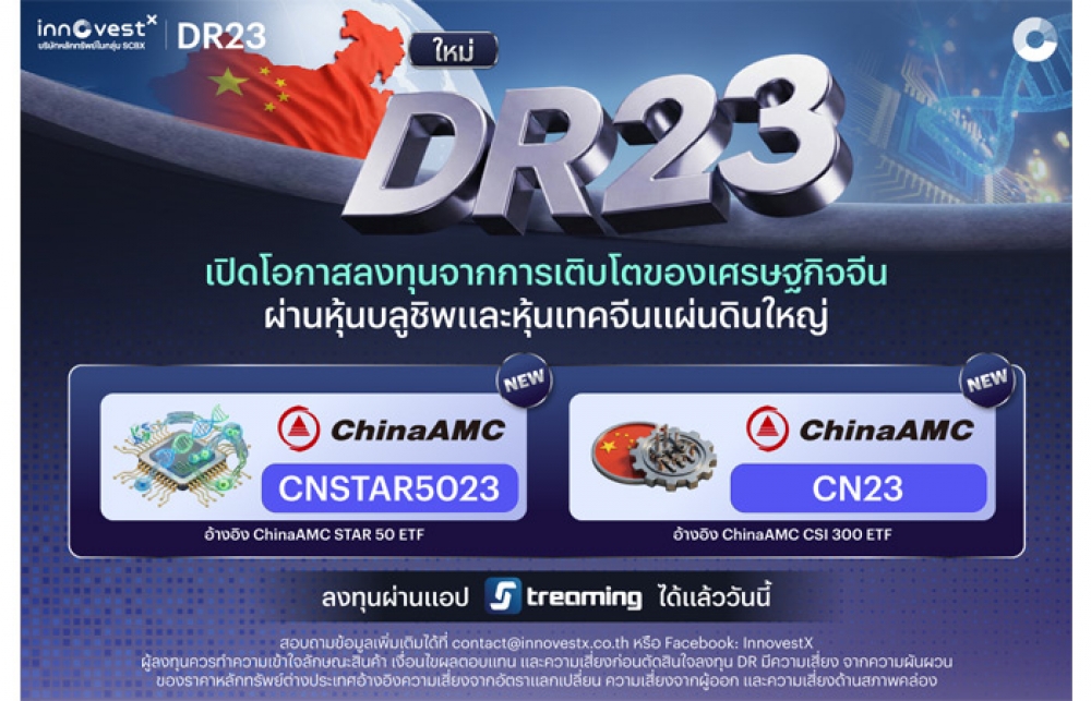 เมื่อวันที่ 15 มกราคม 2569 นายพยนต์ พงศาวรี ประธานเจ้าหน้าที่บริหารการลงทุน บริษัทหลักทรัพย์ อินโนเวสท์ เอกซ์ จำกัด (InnovestX) บริษัทหลักทรัพย์ในกลุ่มเอสซีบีเอกซ์ (SCBX Group) เปิดเผยว่า บริษัทได้ร่วมมือกับ China Asset Management (ChinaAMC) หนึ่งในบริษัทหลักทรัพย์จัดการกองทุนชั้นนำของจีน เปิดตัวตราสารแสดงสิทธิในหลักทรัพย์ต่างประเทศ (DR23) ใหม่ 2 หลักทรัพย์ ได้แก่ CN23 อ้างอิง ChinaAMC CSI 300 ETF เข้าถึงแกนหลักเศรษฐกิจจีน ผ่านหุ้นบลูชิพ A-Share ครอบคลุมภาคเศรษฐกิจสำคัญ ตั้งแต่การเงิน บริโภค เทคโนโลยี ไปจนถึงอุตสาหกรรม และ CNSTAR5023 อ้างอิง ChinaAMC STAR 50 ETF เข้าถึง 50 บริษัทเทคโนโลยีแกนหลักของจีน บน STAR Market ครอบคลุมชิปขั้นสูงไปจนถึงนวัตกรรมแห่งอนาคต