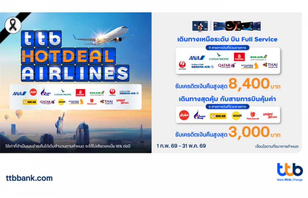 นิวส์ คอนเน็คท์ – ธนาคารทหารไทยธนชาต หรือ TTB เปิดดีลชวนเที่ยว มอบสิทธิพิเศษสำหรับผู้ถือบัตรเครดิต ttb เพื่อสนับสนุนการท่องเที่ยวและเพิ่มความคุ้มค่าให้สมาชิกบัตร พร้อมกระตุ้นให้เกิดการใช้จ่ายอย่างต่อเนื่องในหมวดสายการบิน ซึ่งเป็นหมวดยอดนิยมช่วงต้นปี 2569 โดยมอบเครดิตเงินคืนตามยอดใช้จ่ายต่อเซลล์สลิป ดังนี้ สิทธิพิเศษสำหรับสายการบิน Full Service รับเครดิตเงินคืนสูงสุด 8,400 บาทต่อท่าน เมื่อซื้อบัตรโดยสารที่มียอดใช้จ่ายตั้งแต่ 20,000 บาทขึ้นไปต่อเซลล์สลิป กับ 9 สายการบิน ได้แก่ ANA, Cathay Pacific, Emirates, EVA Air, Japan Airlines, Korean Air, Qatar Airways, Singapore Airlines และ Thai Airways