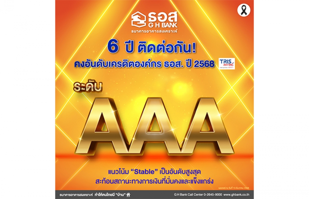 ธอส. คว้าอันดับเครดิตองค์กรจากทริสเตติ้งระดับ "AAA" 6 ปีติดต่อกัน