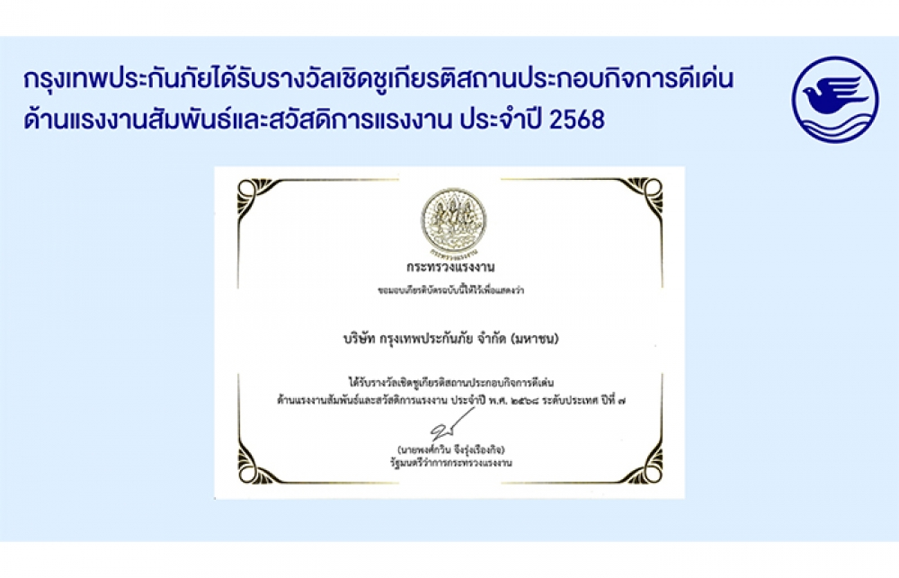 กรุงเทพประกันภัย รับรางวัลเชิดชูเกียรติ “สถานประกอบกิจการดีเด่น" เป็นปีที่ 7