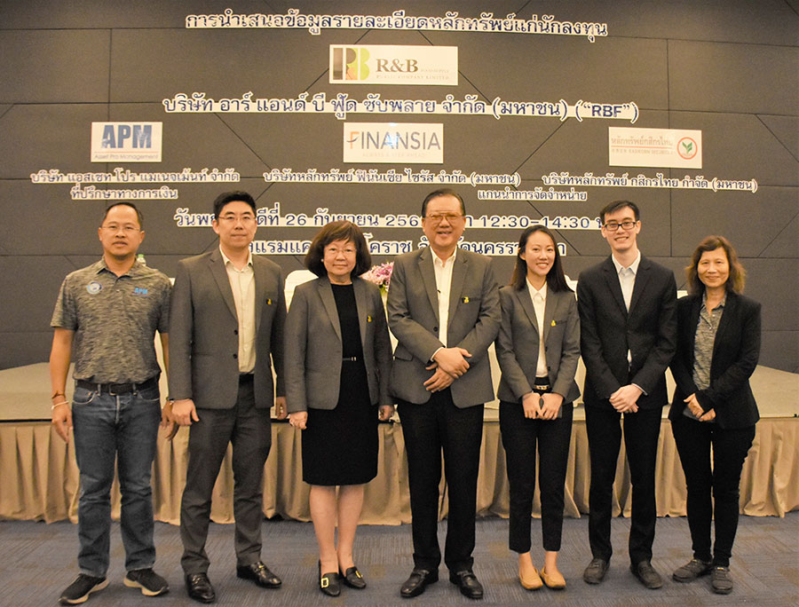 ดร.สมชาย รัตนภูมิภิญโญ (ที่ 4 จากขวา) ประธานเจ้าหน้าที่บริหาร นางเพ็ชรา รัตนภูมิภิญโญ (ที่ 3 จากซ้าย) รองประธานเจ้าหน้าที่บริหาร พร้อมด้วยคณะผู้บริหาร บริษัท อาร์ แอนด์ บี ฟู้ด ซัพพลาย จำกัด (มหาชน) หรือ RBF นำเสนอข้อมูลรายละเอียดหลักทรัพย์แก่นักลงทุนเพื่อเข้าจดทะเบียนในตลาดหลักทรัพย์แห่งประเทศไทย เพื่อเสนอขายหุ้นสามัญเพิ่มทุนให้กับประชาชนเป็นครั้งแรก (IPO) จำนวน 520 ล้านหุ้น มูลค่าที่ตราไว้หุ้นละ 1.00 บาท ปัจจุบันบริษัทมีทุนจดทะเบียนจำนวน 2,000 ล้านบาท แบ่งเป็นหุ้นสามัญจำนวน 2,000 ล้านหุ้น ซึ่งชำระทุนจดทะเบียนแล้ว 1,480 ล้านหุ้น โดยมีนายสมศักดิ์ ศิริชัยนฤมิตร (ที่ 4 จากซ้าย) ประธานเจ้าหน้าที่บริหาร บริษัท แอสเซท โปร แมเนจเม้นท์ จำกัด หรือ APM ในฐานะที่ปรึกษาทางการเงิน พร้อมด้วยนายภควัฒน์ ตุลยนิติกุล (ที่ 2 จากขวา) ผู้อำนวยการฝ่ายวาณิชธนกิจ บริษัทหลักทรัพย์ ฟินันเซีย ไซรัส จำกัด (มหาชน) ในฐานะแกนนำในการจัดจำหน่ายและรับประกันการจัดจำหน่าย ณ โรงแรม แคนทารี่ โคราช จ.นครราชสีมา เมื่อเร็วๆ นี้