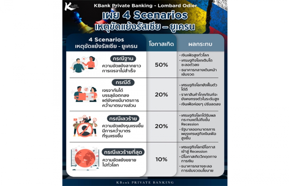 3.กรณีเลวร้าย - ความขัดแย้งระหว่างรัสเซียและยูเครนรุนแรงขึ้น มีการคว่ำบาตรที่รุนแรงขึ้น (โอกาสเกิด 20%) ส่งผลให้เศรษฐกิจโลกได้รับผลกระทบอย่างมีนัยสำคัญ แต่ Lombard Odier มองว่าไม่ถึงขั้นทำให้เศรษฐกิจถดถอย (Recession) เพราะปัจจุบันกิจกรรมเศรษฐกิจโลก ไม่ได้พึ่งพาน้ำมันมากเท่าในอดีต และก่อนหน้านี้เศรษฐกิจโลกถือว่าอยู่ในเกณฑ์ดีมากหลังกิจกรรมทางเศรษฐกิจทยอยฟื้นตัวจากสถานการณ์การแพร่ระบาดของโควิด 19 เริ่มคลี่คลาย นอกจากนี้ รัฐบาลแต่ละประเทศจะออกมาตรการมาพยุงเศรษฐกิจ เช่น ช่วยเหลือค่าครองชีพกลุ่มคนรายได้น้อย เพื่อให้เศรษฐกิจไปต่อได้