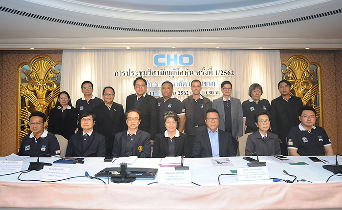คุณเพ็ญพิมล เวศย์วรุตม์ (แถวล่าง กลาง) ประธานกรรมการ และ คุณสุรเดช ทวีแสงสกุลไทย (แถวล่างที่ 3 จากขวา) กรรมการผู้จัดการใหญ่และประธานเจ้าหน้าที่บริหาร พร้อมด้วยคณะกรรมการและผู้บริหาร บริษัท ช ทวี จำกัด (มหาชน) (CHO) ถ่ายภาพร่วมกันภายหลังงานประชุมวิสามัญผู้ถือหุ้นครั้งที่ 1/ 2562 โดยที่ประชุมมีมติอนุมัติขยายกรอบวงเงินในการออกหุ้นกู้จากเดิม 1,000 ล้านบาท เป็น 2,000 ล้านบาท เพื่อรองรับแผนขยายธุรกิจ เพิ่มขีดความสามารถการแข่งขัน จากโอกาสในการรับงานเพิ่ม งานดังกล่าวจัดขึ้น ณ ห้องมรกต ชั้น 3 โรงแรม ดิ เอมเมอรัลด์ ถนนรัชดาภิเษก กรุงเทพมหานคร
