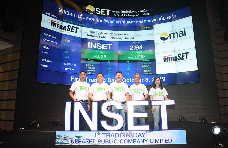คุณแมนพงศ์ เสนาณรงค์ รองผู้จัดการ หัวหน้าสายงานผู้ออกหลักทรัพย์ ตลาดหลักทรัพย์แห่งประเทศไทย พร้อมด้วย คุณประพันธ์ เจริญประวัติ ผู้จัดการ ตลาดหลักทรัพย์ เอ็ม เอ ไอ (mai) คุณยอดฤดี สันตติกุล ผู้ช่วยกรรมการผู้อำนวยการ บริษัทหลักทรัพย์ เอเซีย พลัส จำกัด ร่วมแสดงความยินดีกับ คุณกัมปนาท โลหเจริญวนิช ประธานกรรมการ คุณศักดิ์บวร พุกกะณะสุต กรรมการผู้จัดการ บริษัท อินฟราเซท จำกัด (มหาชน) (INSET) เนื่องในโอกาสที่ INSET เข้าทำการซื้อขายในตลาดหลักทรัพย์ เอ็ม เอ ไอ (mai) เป็นวันแรก ซึ่งได้รับการตอบรับจากนักลงทุนอย่างคึกคัก โดยเปิดตลาดที่ 2.94 บาท/หุ้น เพิ่มขึ้น 9.29% จากราคาไอพีโอ 2.69 บาท/หุ้น ณ หอประชุมศุกรีย์ แก้วเจริญ อาคาร B ชั้น 3 อาคารตลาดหลักทรัพย์แห่งประเทศไทย
