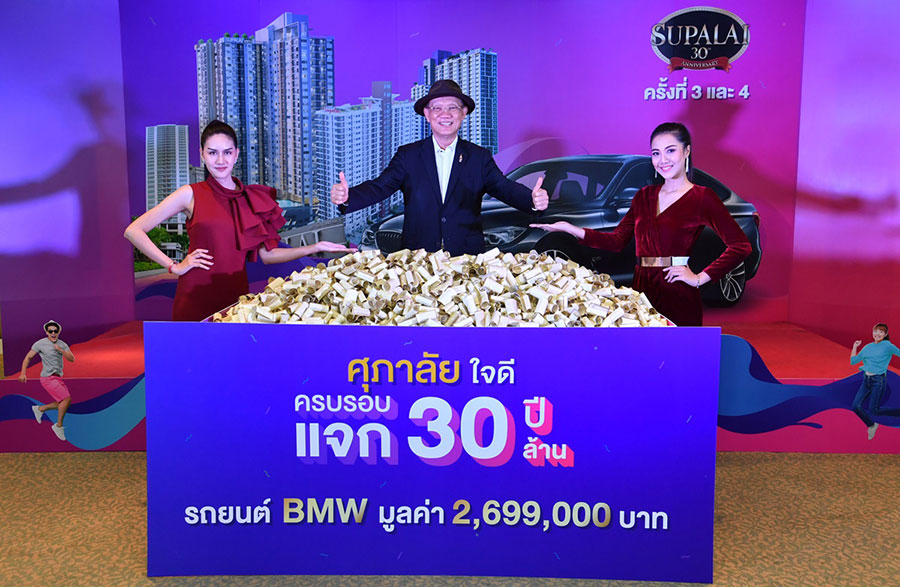 บริษัท ศุภาลัย จำกัด (มหาชน) โดย ดร.ประทีป ตั้งมติธรรม ประธานกรรมการบริหาร พร้อมด้วย นางอัจฉรา ตั้งมติธรรม รองประธานกรรมการบริหาร ให้เกียรติเป็นประธานในพิธีจับรางวัลผู้โชคดีในแคมเปญครั้งยิ่งใหญ่ที่สุดแห่งปี “ศุภาลัย ใจดี ครบรอบ 30 ปี แจก 30 ล้าน” ครั้งที่ 3 และครั้งที่ 4 เมื่อวันที่ 9 ตุลาคม 2562 โดยครั้งนี้จะเป็นการจับรางวัลรอบสุดท้ายของแคมเปญนี้ เพื่อแจกรางวัล รถยนต์ BMW รุ่น BMW 3 Series 320d GT Luxury จำนวน 1 รางวัล ห้องชุดคอนโดมิเนียม จำนวน 3 ยูนิต ได้แก่ โครงการศุภาลัย เวอเรนด้า รัตนาธิเบศร์ โครงการศุภาลัย มอนเต้ @เวียง เชียงใหม่ โครงการศุภาลัย ซิตี้ รีสอร์ท ระยอง บัตรกำนัล มูลค่า 500,000 บาท จำนวน 3 รางวัล บัตรกำนัลเซ็นทรัล มูลค่า 100,000 บาท จำนวน 10 รางวัล SAMSUNG GALAXY S10 จำนวน 32 รางวัล SAMSUNG 4K UHD SMART TV 55" จำนวน 52 รางวัล ณ ห้อง Convention ชั้น 33 อาคารศุภาลัย แกรนด์ ทาวเวอร์ ตรวจสอบรายชื่อ ผู้โชคดีทาง www.supalai.com และ facebook/supalai society (เงื่อนไขและของแถมเป็นไปตามที่บริษัทฯ กำหนด)