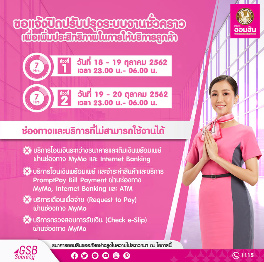 ดร.ชาติชาย พยุหนาวีชัย ผู้อำนวยการธนาคารออมสิน เปิดเผยว่า ธนาคารออมสินมีการปิดปรับปรุงระบบงาน PromptPay (PP Gateway) เป็นการชั่วคราว เพื่อพัฒนาระบบและเพิ่มประสิทธิภาพการให้บริการของธนาคารให้ดียิ่งขึ้น ใน 2 ช่วงเวลา คือ ในวันศุกร์ที่ 18 ตุลาคม 2562 ตั้งแต่เวลา 23.00 น. ถึงวันเสาร์ที่ 19 ตุลาคม 2562 เวลา 06.00 น. และวันเสาร์ที่ 19 ตุลาคม 2562 ตั้งแต่เวลา 23.00 น. ถึงวันอาทิตย์ที่ 20 ตุลาคม 2562 เวลา 06.00 น. ซึ่งจะส่งผลให้ลูกค้าไม่สามารถใช้บริการระบบ PromptPay ได้ ในช่วงเวลาดังกล่าว ผ่านช่องทาง MyMo, Internet Banking และ ATM ในบางธุรกรรม ได้แก่ บริการโอนเงินระหว่างธนาคารและเติมเงินพร้อมเพย์, บริการโอนเงินพร้อมเพย์และชำระสินค้าและบริการ PromptPay Bill Payment, บริการเตือนเพื่อจ่าย (Request to Pay) และบริการตรวจสอบการรับเงิน (Check e-Slip) จึงขออภัยลูกค้าทุกท่านในความไม่สะดวกในครั้งนี้ด้วย