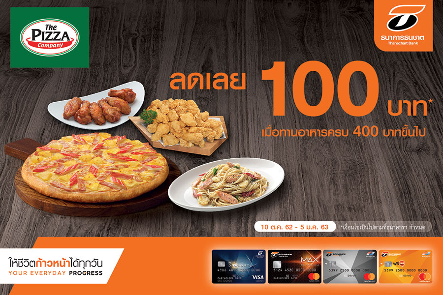 ธนาคารธนชาต จำกัด (มหาชน) ชวนลูกค้าบัตรเครดิตและบัตรเดบิตธนชาต อิ่มสุดคุ้มกับเมนูพิซซ่าที่หลากหลาย พร้อมวัตถุดิบสดใหม่และชีสชั้นเยี่ยม ที่เดอะ พิซซ่า คอมปะนี (The Pizza Company) ทุกสาขา เมื่อทานอาหารครบ 400 บาทขึ้นไป และชำระค่าอาหารด้วยบัตรเครดิตหรือบัตรเดบิตธนชาต รับส่วนลดทันที 100 บาท เพียงสแกน QR Code ที่ร้านพร้อมลงทะเบียนเพื่อรับสิทธิ์ตามเงื่อนไข (ใช้สิทธิ์ได้ที่ร้านเท่านั้น ไม่รวม Delivery) ได้ตั้งแต่ วันนี้ – 31 ธ.ค. 2562 ลูกค้าสามารถสอบถามรายละเอียดเงื่อนไขเพิ่มเติม ได้ที่ธนาคารธนชาต โทร.1770 กด 0 กด 2 หรือที่เว็บไซต์ www.thanachartbank.co.th