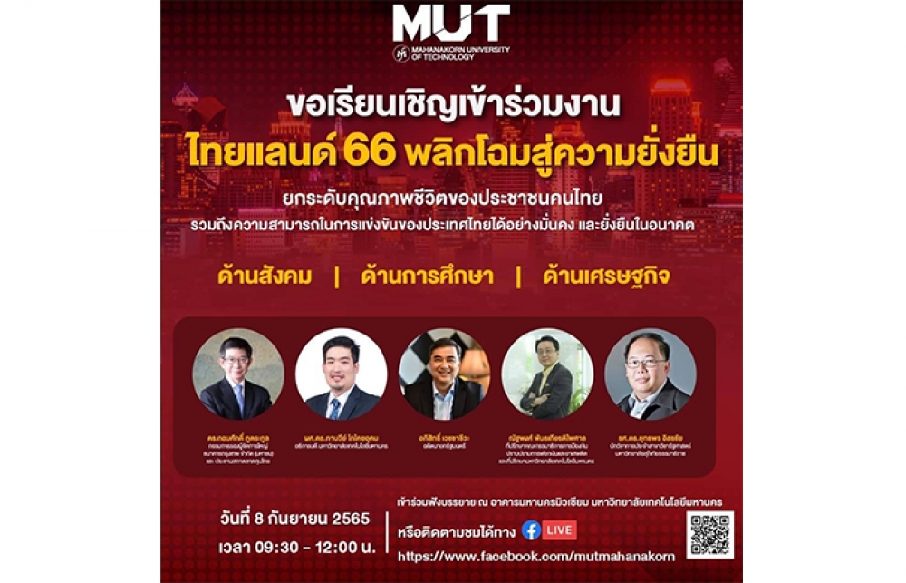 MUT ขอเชิญเข้าร่วมงานสัมมนาในหัวข้อ #ไทยแลนด์66พลิกโฉมสู่ความยั่งยืน งานสัมมนาที่จัดขึ้นเพื่อเสวนาเฟ้นหาวิธียกระดับคุณภาพชีวิตของคนไทย ความสามารถในการแข่งขันของประเทศไทยทั้งทางด้านสังคม การศึกษา และด้านเศรษฐกิจ เพื่อความมั่นคงและยั่งยืนในอนาคตของประเทศไทย วันที่ 8 กันยายน 2565 เวลา 09.30 – 12.00 น. ณ มหานครมิวเซียม มหาวิทยาลัยเทคโนโลยีมหานคร / FB LIVE