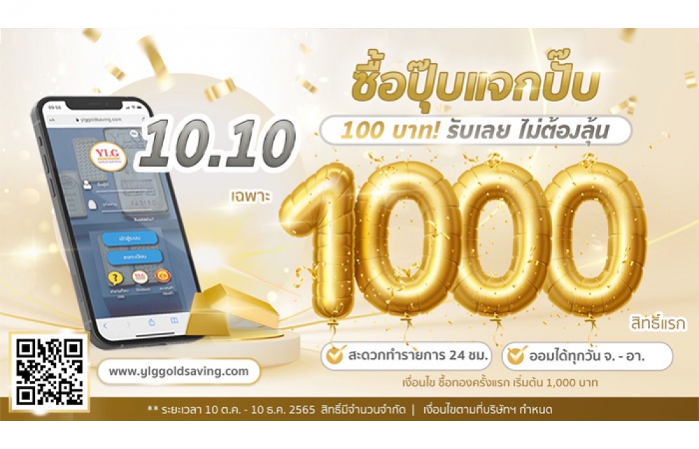 ทั้งนี้ เพื่อเป็นการขอบคุณลูกค้าที่ให้การสนับสนุนมาอย่างต่อเนื่อง YLG จึงได้ออกโปรโมชั่น 10.10 ซื้อปุ๊บแจกปั๊บ 100 บาท รับเลย 1,000 สิทธิ์แรก สำหรับลูกค้าโปรแกรม ออมทอง YLG Gold Saving โดยโปรโมชันนี้จะมอบให้เกือบทั้งไตรมาส 4/65 ตั้งแต่วันที่ 10 ต.ค. - 10 ธ.ค.65 สำหรับลูกค้าใหม่ที่สมัครใช้บริการ และทำการซื้อทองครั้งแรกกับ YLG ผ่าน www.ylggoldsaving.com เริ่มต้น 1,000 บาท ขึ้นไป เฉพาะ 1,000 สิทธิ์แรก รับฟรีเงินออมเพิ่ม จำนวน 100 บาท ไม่ต้องรอลุ้น โดยจะประกาศรายชื่อของผู้ที่ได้รับสิทธิ์ 1,000 ท่านแรก ในวันที่ 12 ธ.ค.65
