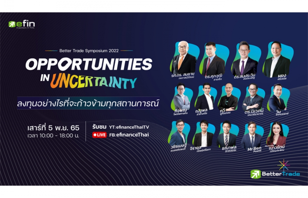โดยงาน Better Trade Symposium 2022 : ภายใต้แนวคิด “Opportunities in Uncertainty ลงทุนอย่างไร ที่จะก้าวข้ามทุกสถานการณ์” เตรียมจัดขึ้นในวันเสาร์ที่ 5 พ.ย.65 ระหว่างเวลา 10.00 -18.00 น. ณ ชั้น 5 Thailand eSports Arena The Street รัชดา สำหรับนักลงทุนที่สนใจสามารถลงทะเบียนฟรีได้แล้วตั้งแต่วันนี้ คลิก : https://www.efinancethai.com/bettertrade/bt2022 และสามารถรับชมผ่านช่องทาง Page Facebook : efinancethai และ YouTube : efinancethai TV