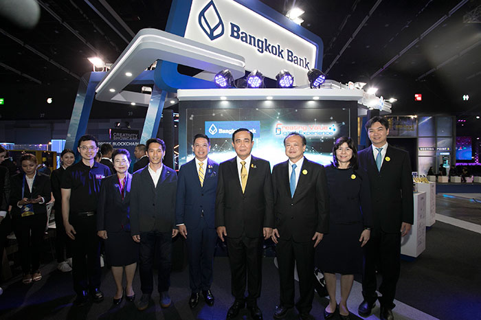 นายศิริเดช เอื้องอุดมสิน รองผู้จัดการใหญ่ (ที่ 3 จากขวา) นางสาวธัญฑิกา โพธิสมภรณ์ ผู้ช่วยผู้จัดการใหญ่ (ที่ 2 จากขวา) พร้อมคณะผู้บริหาร ธนาคารกรุงเทพ จำกัด (มหาชน) ให้การต้อนรับ พลเอกประยุทธ์ จันทร์โอชา นายกรัฐมนตรี (ที่ 4 จากขวา) และนายพุทธิพงษ์ ปุณณกันต์ รัฐมนตรีว่าการกระทรวงดิจิทัลเพื่อเศรษฐกิจและสังคม (ที่ 4 จากซ้าย) ในโอกาสให้เกียรติเยี่ยมชมบูธธนาคารกรุงเทพ ในงานมหกรรมแสดงนวัตกรรมดิจิทัลระดับนานาชาติ (Digital Thailand Big Bang 2019: ASEAN Connectivity) ณ ศูนย์นิทรรศการและการประชุมไบเทค