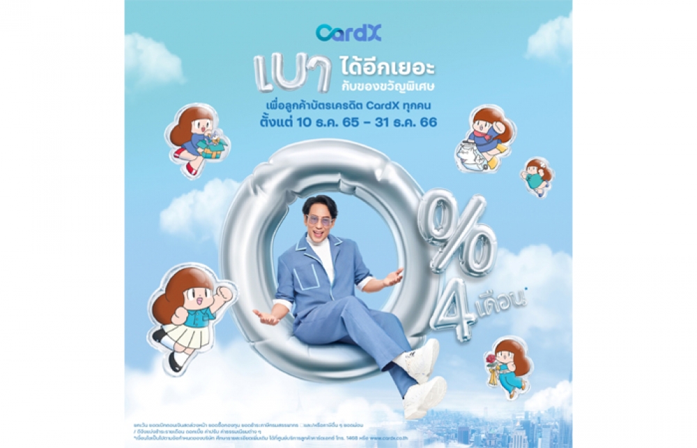 ทั้งนี้ เพื่อเป็นการต้อนรับลูกค้าบัตรเครดิตของเราทุกคน CardX พร้อมมอบของขวัญสุดพิเศษ ผ่านแคมเปญ Delight 0% 4 เดือน มอบอำนาจในการจับจ่ายอย่างที่ไม่เคยมีมาก่อน โดยให้ลูกค้าเลือกจ่าย 0% ได้นาน 4 เดือน ทุกยอดการใช้จ่ายขั้นต่ำ 2,000 บาทต่อเซลล์สลิป ในหลากหลายหมวดหมู่ ตั้งแต่วันที่ 10 ธ.ค.65 - 31 ธ.ค.66