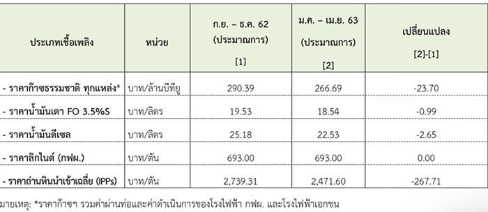 3. แนวโน้มราคาเชื้อเพลิงที่ใช้ในการผลิตไฟฟ้าคาดว่าราคาก๊าซธรรมชาติเท่ากับ 266.69 บาทต่อล้านบีทียู ปรับตัวลดลงจากงวดที่ผ่านมา 23.70 บาทต่อล้านบีทียู ราคาถ่านหินนำเข้าเฉลี่ยของโรงไฟฟ้าเอกชน