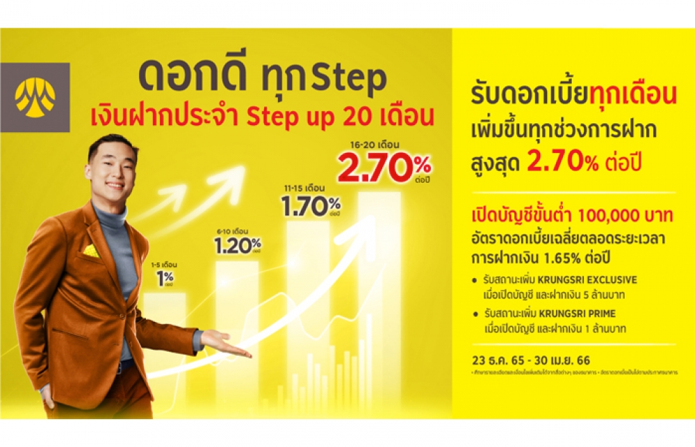 นิวส์ คอนเน็คท์ - ธนาคารกรุงศรีอยุธยา จำกัด (มหาชน) ขยายระยะเวลาเปิดบัญชีเงินฝากประจำ Step up 20 เดือน ต่ออีก 2 เดือน โดยสามารถสมัครเปิดบัญชีได้แล้ว จนถึง 30 เมษายน 2566 ด้วยยอดเปิดบัญชีขั้นต่ำ 100,000 บาท รับดอกเบี้ยทุกเดือน เพิ่มขึ้นทุกช่วงการฝากสูงสุด 2.70% ต่อปี โดยมีอัตราดอกเบี้ยเฉลี่ยตลอดระยะเวลาการฝากเงิน 1.65% ต่อปี พร้อมรับสถานะเพิ่ม KRUNGSRI PRIME เมื่อเปิดบัญชีและฝากเงิน 1 ล้านบาท หรือรับสถานะเพิ่ม KRUNGSRI EXCLUSIVE เมื่อเปิดบัญชีและฝากเงิน 5 ล้านบาท ผู้สนใจสามารถดูรายละเอียดและเงื่อนไขเพิ่มเติมได้ที่ https://www.krungsri.com/th/promotions/personal/step-up-20-month