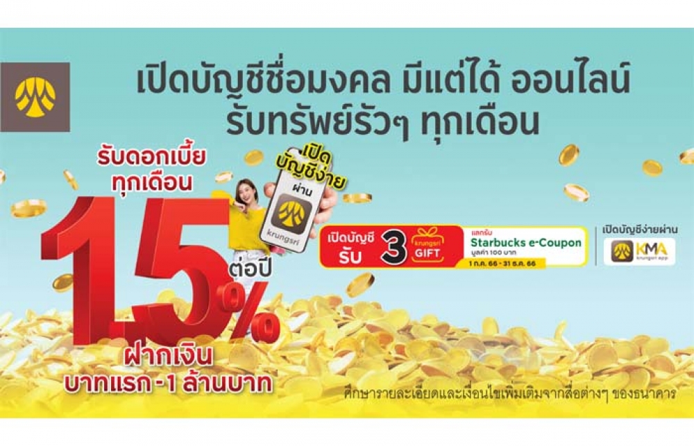 นิวส์ คอนเน็คท์ - ธนาคารกรุงศรีอยุธยา จำกัด (มหาชน)) ให้คุณรับทรัพย์ได้รัวๆ ต่อเนื่องทุกเดือน เมื่อเปิดบัญชีเงินฝากออมทรัพย์ “มีแต่ได้ ออนไลน์” ผ่านทาง KMA krungsri app ตั้งแต่การฝากเงินบาทแรก ถึง 1 ล้านบาท รับดอกเบี้ยทุกเดือน ด้วยอัตราดอกเบี้ย 1.5% ต่อปี และหากมีธุรกรรมการโอนเงินเข้าบัญชีออมทรัพย์ มีแต่ได้ ออนไลน์ ในเดือนที่เปิดบัญชีครั้งแรกขั้นต่ำ 200 บาทขึ้นไป ระหว่างวันที่ 1 กรกฎาคม 2566 – 31 ธันวาคม 2566 รับ Krungsri GIFT จำนวน 3 กิฟท์ แลกรับ Starbucks e-Coupon มูลค่า 100 บาท หรือส่วนลดร้านค้ามากมาย ที่เมนู GIFT & Privileges บน KMA krungsri app