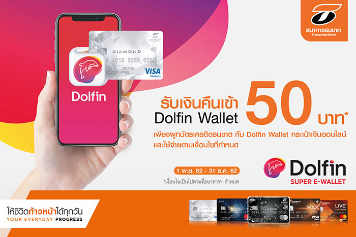 ธนาคารธนชาต จำกัด (มหาชน) ช่วยให้ทุกการใช้จ่ายของลูกค้าบัตรเครดิตธนชาตเป็นเรื่องสนุกและฟินกว่าเดิม จ่ายเพลินไม่ต้องง้อเงินสด เพียงผูกบัตรเครดิตธนชาตกับแอปพลิเคชัน ดอลฟิน วอลเล็ท (Application Dolfin Wallet) กระเป๋าเงินออนไลน์ และใช้จ่ายตั้งแต่ 300 บาทขึ้นไป / เซลล์สลิป รับเงินคืนเข้า Dolfin Wallet ทันที 50 บาท โดยลูกค้ารับสิทธิ์ได้ 1 ครั้ง ตั้งแต่วันนี้ – 31 ธ.ค. 62 สอบถามรายละเอียดเพิ่มเติมได้ ณ จุดขาย และที่ธนาคารธนชาต โทร.1770 หรือ www.thanachartbank.co.th