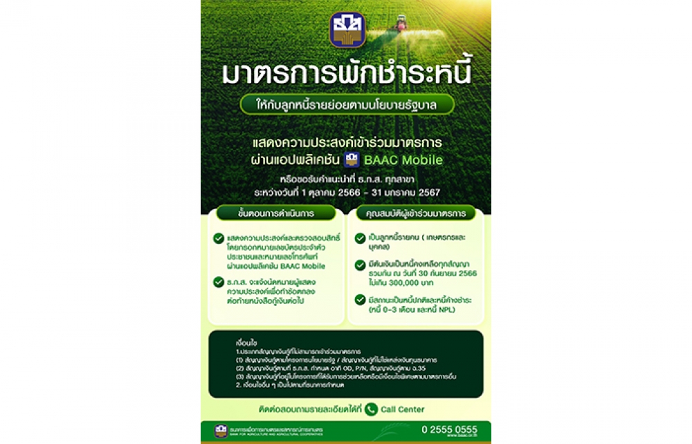 เมื่อวันที่ 26 กันยายน 2566 นายฉัตรชัย ศิริไล ผู้จัดการธนาคารเพื่อการเกษตรและสหกรณ์การเกษตร (ธ.ก.ส.) เปิดเผยว่า ตามที่รัฐบาลมีนโยบายพักชำระหนี้ลูกหนี้รายย่อย ทั้งต้นเงินและดอกเบี้ย เพื่อช่วยแบ่งเบาภาระหนี้สินและสนับสนุนการฟื้นตัวของเกษตรกรหลังภาวะวิกฤต COVID-19 และเศรษฐกิจชะลอตัว โดยในวันที่ 26 กันยายน 2566 คณะรัฐมนตรีได้มีมติเห็นชอบให้ ธ.ก.ส. ดำเนินมาตรการพักชำระหนี้ให้กับเกษตรกรและบุคคลที่มีสถานะเป็นหนี้ปกติและหนี้ค้างชำระที่มี ต้นเงินคงเป็นหนี้ทุกสัญญารวมกัน ณ 30 กันยายน 2566 ไม่เกิน 300,000 บาท ซึ่งมีเกษตรกรที่เข้าเกณฑ์ดังกล่าว จำนวนกว่า 2.69 ล้านราย