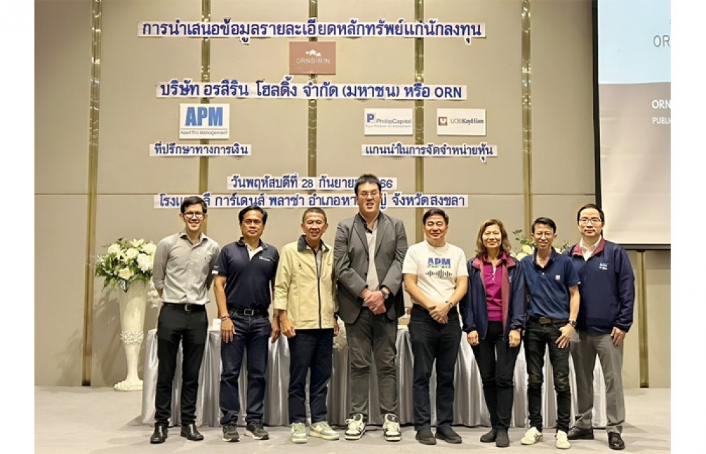 นิวส์ คอนเน็คท์ - นายบุญเลิศ บูรณุปกรณ์ (ที่ 3 จากซ้าย) ประธานกรรมการบริหาร นายปรีดิกร บูรณุปกรณ์ (ที่ 4 จากซ้าย) ประธานเจ้าหน้าที่บริหาร นายอรรคเดช อุดมศิริธำรง (ซ้ายสุด) กรรมการบริหาร บริษัท อรสิริน โฮลดิ้ง จำกัด (มหาชน) หรือ (ORN) พร้อมด้วย ดร.สมภพ ศักดิ์พันธ์พนม (ที่ 4 จากขวา) ประธานกรรมการ นายสุพล ค้าพลอยดี (ขวาสุด) กรรมการผู้จัดการ บริษัท แอสเซท โปร แมเนจเม้นท์ จำกัด (APM) ที่ปรึกษาทางการเงิน และ นายวิชา โตมานะ (ที่ 2 จากซ้าย) กรรมการผู้จัดการ สายงานวาณิชธนกิจ บริษัทหลักทรัพย์ ฟิลลิป (ประเทศไทย) จำกัด (มหาชน) ในฐานะผู้จัดจำหน่ายและรับประกันการจำหน่าย ร่วมนำเสนอข้อมูลการเสนอขายหุ้น IPO และ ศักยภาพการเติบโต แก่นักลงทุน จ.สงขลา โดยมีนักลงทุนสนใจเข้ารับฟังข้อมูลเป็นจำนวนมาก ณ โรงแรมลีการ์เดนส์ พลาซ่า อำเภอหาดใหญ่ จังหวัดสงขลา