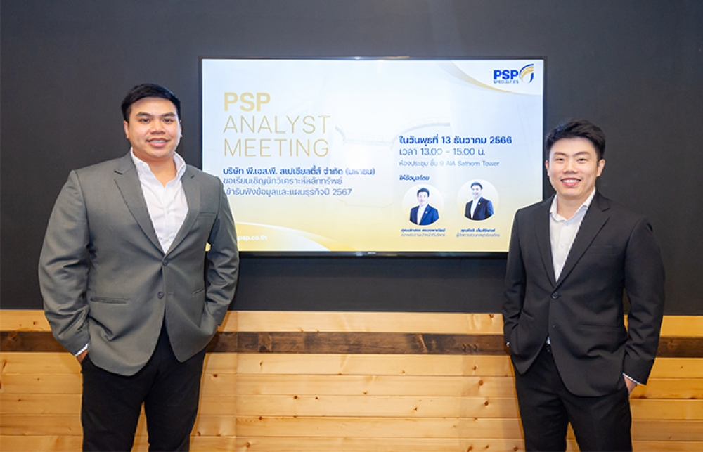 คุณเสกสรร ครองพาณิชย์ (ขวา) รองประธานเจ้าหน้าที่บริหาร และคุณกีรติ เต็มศิริพงศ์ (ซ้าย) ผู้จัดการส่วนกลยุทธ์องค์กร บมจ. พี.เอส.พี. สเปเชียลตี้ส์ จำกัด (มหาชน) (PSP) ร่วมให้ข้อมูลภาพรวมและแผนการดำเนินธุรกิจปี 2567 กับนักวิเคราะห์หลักทรัพย์ ในงาน Analyst Meeting โดยผู้บริหารมั่นใจว่าแนวโน้มผลประกอบการปี 2567 จะเติบโตอย่างแข็งแกร่ง โดยมุ่งเน้นการขยายธุรกิจผลิตภัณฑ์หล่อลื่นในตลาดต่างประเทศ ควบคู่ไปกับการพัฒนาผลิตภัณฑ์หล่อลื่นและน้ำยาหล่อเย็นแบตเตอรี่สำหรับรถยนต์ไฟฟ้า น้ำมันหล่อลื่นและจาระบี Food Grade ในภาคอุตสาหกรรมอาหาร รวมไปถึงน้ำมันผสมยางและน้ำมันหม้อแปลงไฟฟ้าชีวภาพ พร้อมลุยตลาด B2C สร้างโอกาสธุรกิจใหม่หลังเปิดตัว 3 ผลิตภัณฑ์ ทั้งผลิตภัณฑ์หล่อลื่นอเนกประสงค์, สเปรย์ทำความสะอาดเครื่องปรับอากาศ และสเปรย์ขจัดกลิ่นไม่พึงประสงค์ ตอกย้ำผู้นำธุรกิจหล่อลื่นครบวงจรชั้นนำของประเทศ งานดังกล่าวจัดขึ้น ณ อาคารเอไอเอ สาทร ทาวเวอร์ เมื่อวันที่ 13 ธันวาคม 2566 ที่ผ่านมา