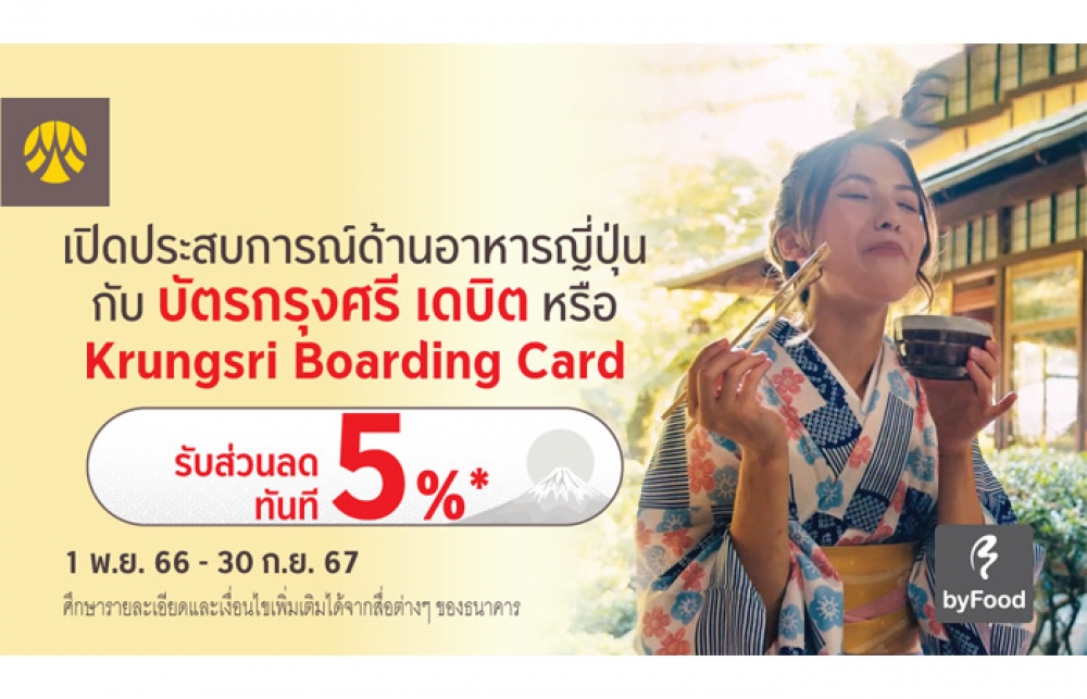 นิวส์ คอนเน็คท์ – ธนาคารกรุงศรีอยุธยา จำกัด (มหาชน) ชวนลูกค้าเปิดประสบการณ์ด้านอาหารญี่ปุ่นแบบเอ็กซ์คลูซีฟ มอบส่วนลด 5% เมื่อจองกิจกรรมด้านอาหารสุดพิเศษที่ประเทศญี่ปุ่นมากกว่า 2,000 ร้านอาหาร/กิจกรรม อาทิ กิจกรรมทัวร์เปิดประสบการณ์อาหารญี่ปุ่น (Food Experience) กิจกรรมเรียนทำอาหารญี่ปุ่น (Cooking Class) รวมถึงการจองร้านอาหารยอดนิยม (Restaurant reservation) ผ่านแพลตฟอร์ม byFood.com และชำระผ่านบัตรกรุงศรี เดบิต ทุกประเภท หรือ Krungsri Boarding Card ตั้งแต่วันที่ 1 พฤศจิกายน 2566 – 30 กันยายน 2567