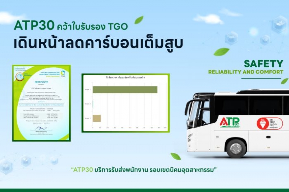 เมื่อวันที่ 22 มีนาคม 2567 นายปิยะ เตชากูล กรรมการผู้จัดการ บริษัท เอทีพี 30 จำกัด (มหาชน) หรือ ATP30 ผู้ดำเนินธุรกิจให้บริการรถรับส่งพนักงานจากแหล่งที่พักอาศัยในเขตชุมชนไปยังโรงงานอุตสาหกรรมหรือสถานประกอบการโดยเฉพาะรอบเขตนิคมอุตสาหกรรมในภาคตะวันออก (Eastern Seaboard) เปิดเผยว่า บริษัทได้ใบรับรองคาร์บอนฟุตพริ้นท์ขององค์กร จากองค์การบริหารจัดการก๊าซเรือนกระจก (องค์การมหาชน) หรือ อบก. (TGO) ภาคการบริการ และสำนักงาน