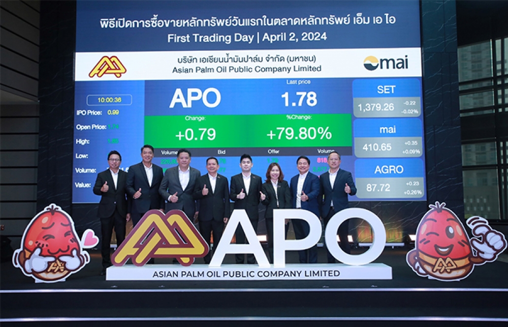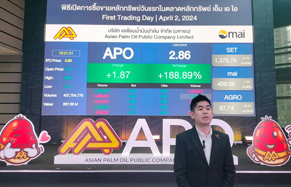 เมื่อวันที่ 2 เมษายน 2567 บริษัท เอเชียนน้ำมันปาล์ม จำกัด (มหาชน) หรือ APO ผู้เชี่ยวชาญธุรกิจสกัดน้ำมันปาล์มดิบ จำหน่ายผลิตภัณฑ์หลักจากการสกัดน้ำมันปาล์มดิบและผลพลอยได้ ผลิตไฟฟ้าจากก๊าซชีวภาพเพื่อจำหน่ายให้กับการไฟฟ้าส่วนภูมิภาค เข้าจดทะเบียนและทำการซื้อขายเป็นวันแรกในตลาดหลักทรัพย์ เอ็ม เอ ไอ หรือ mai โดยราคาเปิดซื้อขายที่ 1.74 บาท เพิ่มขึ้น 0.75 บาท หรือ 75.76% จากราคา IPO ที่หุ้นละ 0.999 บาท และระหว่างวัน ราคาขึ้นไปทำจุดสูงสุดที่ 2.86 บาท