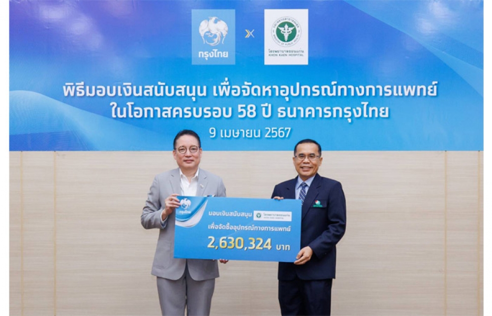 ทั้งนี้ ธนาคารกรุงไทย ให้ความสำคัญกับบริการด้าน “สุขภาพและการรักษาพยาบาล” มาอย่างต่อเนื่อง เพื่อให้คนไทยสามารถเข้าถึงบริการด้านสาธารณสุข และสิทธิการรักษาพยาบาลอย่างสะดวกและทั่วถึง โดยคณะกรรมการ ผู้บริหาร พนักงาน และบริษัทในเครือ ได้ร่วมบริจาคเงินในโอกาสธนาคารครบรอบ 58 ปี เพื่อสมทบทุนผ่านระบบ e-Donation ในการจัดหาเครื่องมือและอุปกรณ์ทางการแพทย์ให้กับโรงพยาบาลขอนแก่น เช่น เครื่องช่วยหายใจ เครื่องตรวจคลื่นไฟฟ้าหัวใจ เครื่องปั่นแยกเม็ดเลือดแดง และเครื่องติดตามการทำงานของหัวใจและสัญญาณชีพ เป็นต้น เพื่อให้ทีมแพทย์มีอุปกรณ์การรักษาพยาบาลที่ทันสมัย ประชาชนในพื้นที่และจังหวัดใกล้เคียง ได้รับการรักษาที่มีประสิทธิภาพ รวดเร็วและปลอดภัย โดยไม่จำเป็นต้องเดินทางมารักษาที่กรุงเทพฯ ยกระดับคุณภาพชีวิตประชาชนให้ดีขึ้นในทุกวัน ตามวิสัยทัศน์ “กรุงไทย เคียงข้างไทย สู่ความยั่งยืน”