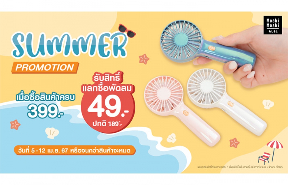 นิวส์ คอนเน็คท์ - บริษัท โมชิ โมชิ รีเทล คอร์ปอเรชั่น จำกัด (มหาชน) หรือ MOSHI ผู้นำธุรกิจร้านค้าปลีกสินค้าไลฟ์สไตล์รายใหญ่ของประเทศไทย จัดโปรโมชันพิเศษ! ชวนช้อปคลายร้อนในช่วงซัมเมอร์ เพียงซื้อสินค้าครบ 399 บาทขึ้นไป รับสิทธิ์แลกซื้อ ‘พัดลมมือถือ’ ราคาเพียง 49 บาทเท่านั้น จากปกติ 189 บาท เตรียมพร้อมรับความเย็นสดชื่น กับไอเทมสุดฮอตที่ห้ามพลาด ให้กลุ่มลูกค้าได้ช้อปเพื่อเตรียมพร้อมรับเทศกาลหยุดยาว ตั้งแต่วันนี้ – 12 เมษายน 2567 นี้ หรือจนกว่าสินค้าจะหมด ในทุกสาขาค้าปลีกทั่วประเทศ ติดตามรายละเอียดเพิ่มเติมได้ที่ Facebook Fanpage Moshi Moshi : https://www.facebook.com/moshimoshi.jp