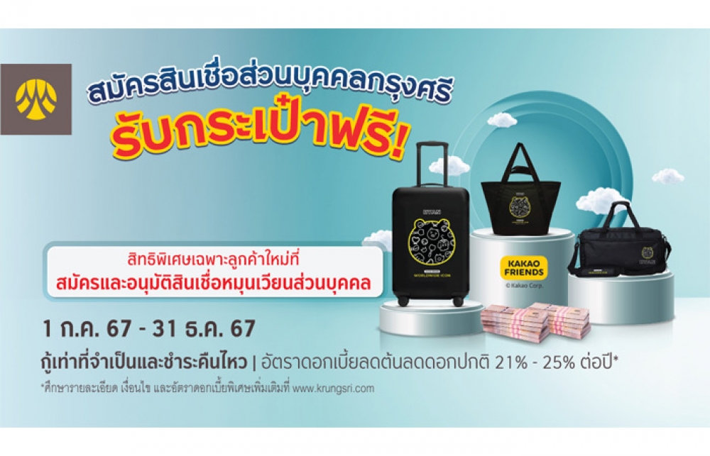 นิวส์ คอนเน็คท์ - ธนาคารกรุงศรีอยุธยา จำกัด (มหาชน)) มอบสิทธิพิเศษสำหรับลูกค้าใหม่ที่สมัครสินเชื่อหมุนเวียนส่วนบุคคลระหว่างวันที่ 1 ก.ค. – 31 ธ.ค. 2567 และรับเงินกู้โดยวิธีโอนเงินเข้าบัญชีเงินฝากธนาคารกรุงศรีอยุธยา ภายในวันที่ 31 มกราคม 2568 รับทันทีของกำนัลตามวงเงินอนุมัติ ดังนี้ วงเงินอนุมัติตั้งแต่ 150,000 - 499,999 บาท และได้รับอนุมัติสินเชื่อหมุนเวียนส่วนบุคคลในอัตราดอกเบี้ยปกติ จะได้รับกระเป๋า Kakao Friends Tote Bag Limited Edition มูลค่า 1,950 บาท, วงเงินอนุมัติตั้งแต่ 500,000 - 999,999 บาท จะได้รับกระเป๋า Kakao Friends Sport Bag Limited Edition มูลค่า 2,750 บาท และวงเงินอนุมัติตั้งแต่ 1,000,000 บาทขึ้นไป จะได้รับกระเป๋าเดินทางล้อลาก Kakao Friends Luggage Limited Edition มูลค่า 5,290 บาท ผู้ที่สนใจสามารถดูรายละเอียดและเงื่อนไขเพิ่มเติมได้ที่ เพิ่มเติมได้ที่ https://www.krungsri.com/th/promotions/personal/ploan-polo-bag