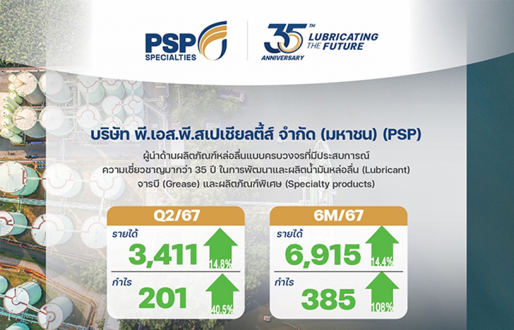 เมื่อวันที่ 27 สิงหาคม 2567 นายเสกสรร ครองพาณิชย์ รองประธานเจ้าหน้าที่บริหาร บริษัท พี.เอส.พี. สเปเชียลตี้ส์ จำกัด (มหาชน) หรือ PSP ผู้นำด้านผลิตภัณฑ์หล่อลื่นแบบครบวงจรที่มีประสบการณ์ความเชี่ยวชาญมากว่า 35 ปี ในการพัฒนาและผลิตน้ำมันหล่อลื่น (Lubricant) จาระบี (Grease) และผลิตภัณฑ์พิเศษ (Specialty products) เปิดเผยว่า แนวโน้มผลประกอบการครึ่งหลังปี 2567 คาดว่าผลงานจะโตต่อเนื่อง โดยได้รับปัจจัยสนับสนุนจากปริมาณการขายทั้งใน และต่างประเทศ ที่มีแนวโน้มเพิ่มขึ้น ด้วยการใช้กลยุทธ์เจาะกลุ่มลูกค้าต่างประเทศด้วยบริการแบบครบวงจรและการให้บริการมาตรฐานระดับสากล ซึ่งดีมานด์ของกลุ่มผลิตภัณฑ์หล่อลื่นยังเติบโตขึ้นอย่างต่อเนื่องตามการขยายตัวของภาคยานยนต์และอุตสาหกรรม