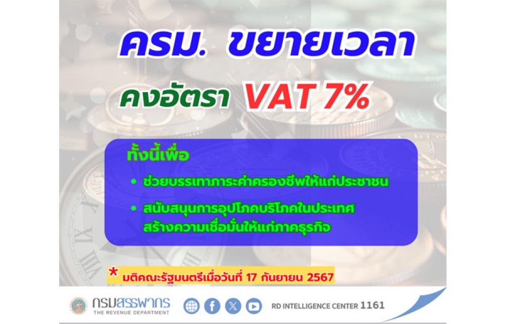 เมื่อวันที่ 17 กันยายน 2567 ดร.กุลยา ตันติเตมิท อธิบดีกรมสรรพากร เปิดเผยว่า “กระทรวงการคลังโดยกรมสรรพากรตระหนักถึงความสำคัญต่อความมั่นคงในทางเศรษฐกิจของประเทศ จึงได้เสนอร่างพระราชกฤษฎีกาออกตามความในประมวลรัษฎากร ว่าด้วยการลดอัตราภาษีมูลค่าเพิ่ม (ฉบับที่..) พ.ศ. .... ขยายระยะเวลาการลดอัตราภาษีมูลค่าเพิ่มเหลือ 7% (รวมภาษีท้องถิ่น) ออกไปอีก 1 ปี สำหรับการขายสินค้า การให้บริการ หรือการนำเข้าทุกกรณี ตั้งแต่วันที่ 1 ต.ค. 2567 ถึงวันที่ 30 ก.ย. 2568 เพื่อรักษาระดับการขยายตัวของการอุปโภคบริโภคภายในประเทศ ภาคธุรกิจและภาคครัวเรือนไม่มีภาระทางภาษีเพิ่มขึ้น อันจะส่งผลให้เศรษฐกิจไทยขยายตัวได้ตามเป้าหมาย